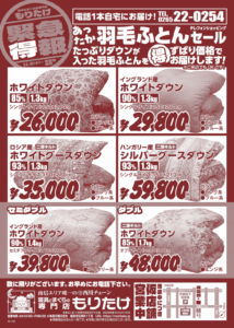 西川チェーン寝具専門店もりたけから羽毛ふとんの緊急得報です✨