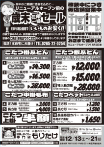 リニューアルオープン前の「歳末在庫一掃セール」    期間 12月13日(土)~21日(日)