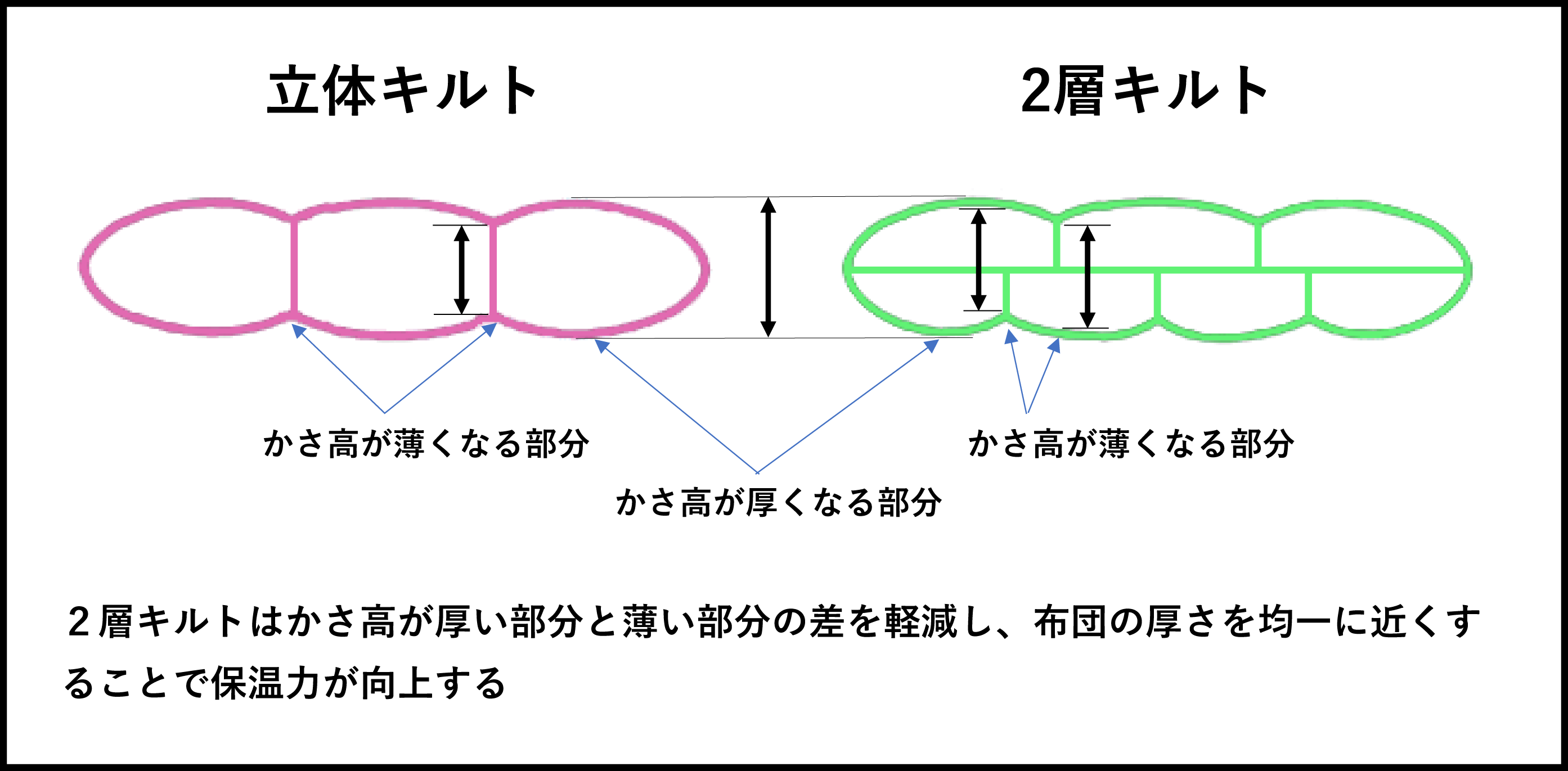 2層キルトは立体キルトと比べ保温力を高くするために立体キルトの弱点となる「厚い部分と薄い部分」のギャップを2層にすることで軽減し保温力を上げる効果を生みます。 ※下図参照