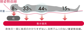 1枚ものと3分割の違いは何かというと、マットにかかる体重の比率が図のように中央部が一番多く、次いで背中部分、そして脚部分となります。