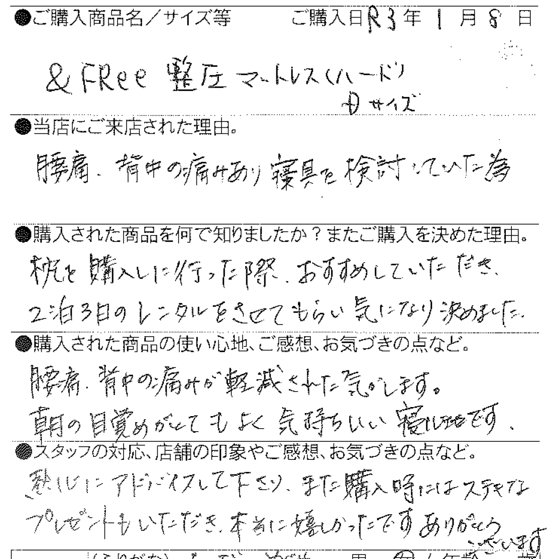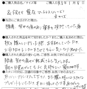 【西川】整圧マットレス &Free (ハード) ダブル 飯田市 47歳 女性