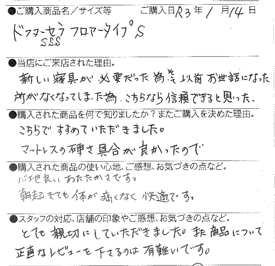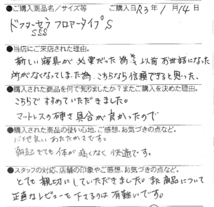 【西川】ドクターセラSSS フロアタイプ 高森町 44歳 女性 2021 1/22 お客様の声 2021年1月22日 お客様の声 5月8日(日) 母の日のプレゼントに感謝を込めて"まくら"を贈りましょう! お客様からリピート購入していただきました(へへ) 関連記事 【西川】[エアーポータブル]モバイルマット (S) 豊丘村 66歳 女性 2025年10月29日 【西川】&Free整圧マットレス -ハード(S)200cm 飯田市 33歳 男性 2025年5月28日 【西川】&Free整圧マットレス -ハード(S)200cm 飯田市 69歳 女性 2025年4月22日 【西川】&Free整圧マットレス -ハード195cm(D) 豊丘村 44歳 男性 2025年3月13日 【西川】エアーSX ハード三つ折りタイプ (S) 名古屋市 58歳 男性 2025年1月23日 【西川】AiR01-SE ベーシック(シングル) 飯田市 46歳 女性 2025年1月3日 【西川】&Free整圧マットレス -レギュラー195cm(S) 1台 / 羽毛ふとん(SL)2層キルトマザーグースダウン93% 飯田市 39歳 女性 2024年12月5日 【西川】エアーSX レギュラー (S) 飯田市 38歳 女性 2024年12月5日