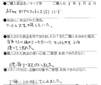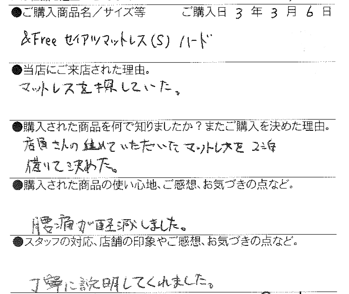 【西川】整圧マットレス &Free (ハード) シングル 飯田市 42歳 男性 2021 3/26 お客様の声 2021年3月26日 お客様の声 西川の温熱敷ふとん・羽毛ふとん、お買い替え30,000円下取りセール! 期間3/19(金)より 【西川】ドクターセラSSS フロアタイプ シングル 飯田市 83歳 女性 関連記事 【西川】[エアーポータブル]モバイルマット (S) 豊丘村 66歳 女性 2025年10月29日 【西川】&Free整圧マットレス -ハード(S)200cm 飯田市 33歳 男性 2025年5月28日 【西川】&Free整圧マットレス -ハード(S)200cm 飯田市 69歳 女性 2025年4月22日 【西川】&Free整圧マットレス -ハード195cm(D) 豊丘村 44歳 男性 2025年3月13日 【西川】エアーSX ハード三つ折りタイプ (S) 名古屋市 58歳 男性 2025年1月23日 【西川】AiR01-SE ベーシック(シングル) 飯田市 46歳 女性 2025年1月3日 【西川】&Free整圧マットレス -レギュラー195cm(S) 1台 / 羽毛ふとん(SL)2層キルトマザーグースダウン93% 飯田市 39歳 女性 2024年12月5日 【西川】エアーSX レギュラー (S) 飯田市 38歳 女性 2024年12月5日
