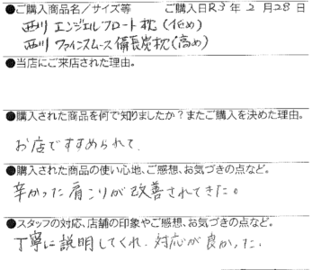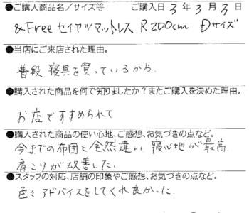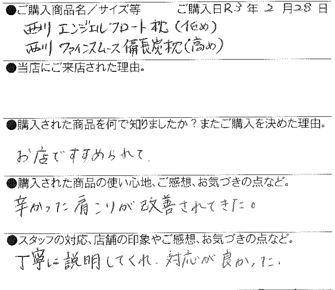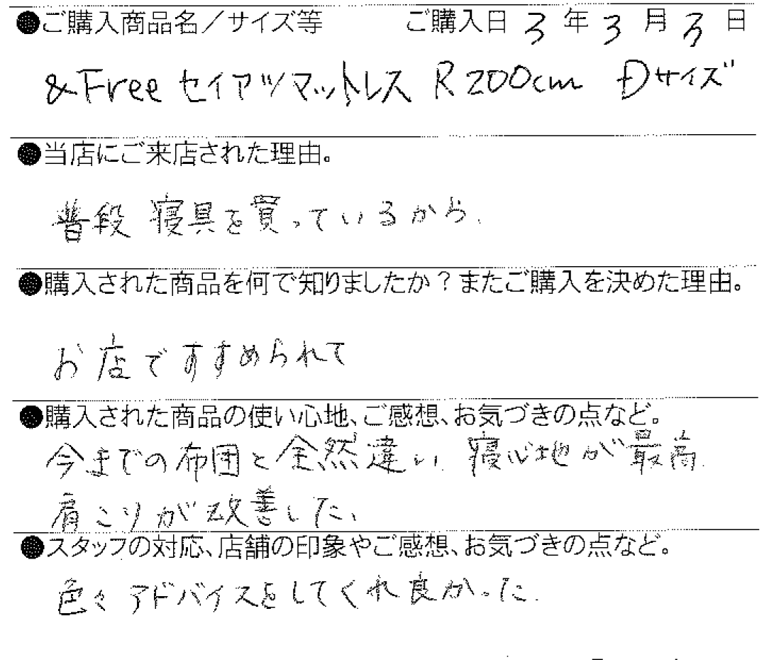 【西川】ファインクォォリティー 備長炭枕(高)/エンジェルフロート枕(低)/&Free 整圧マットレス (レギュラー,200cm,ダブル)R 高森町 30代 夫婦 2021 4/16 お客様の声 2021年4月16日 お客様の声 【西川】エアー01SE (S) レギュラー (&Free KA 三つ折りタイプ) 飯田市 74歳 男性 【西川】エアー03 レギュラー (SD) 飯田市 26歳 男性 関連記事 【西川】[エアーポータブル]モバイルマット (S) 豊丘村 66歳 女性 2025年10月29日 【西川】&Free整圧マットレス -ハード(S)200cm 飯田市 33歳 男性 2025年5月28日 【西川】&Free整圧マットレス -ハード(S)200cm 飯田市 69歳 女性 2025年4月22日 【西川】&Free整圧マットレス -ハード195cm(D) 豊丘村 44歳 男性 2025年3月13日 【西川】エアーSX ハード三つ折りタイプ (S) 名古屋市 58歳 男性 2025年1月23日 【西川】AiR01-SE ベーシック(シングル) 飯田市 46歳 女性 2025年1月3日 【西川】&Free整圧マットレス -レギュラー195cm(S) 1台 / 羽毛ふとん(SL)2層キルトマザーグースダウン93% 飯田市 39歳 女性 2024年12月5日 【西川】エアーSX レギュラー (S) 飯田市 38歳 女性 2024年12月5日