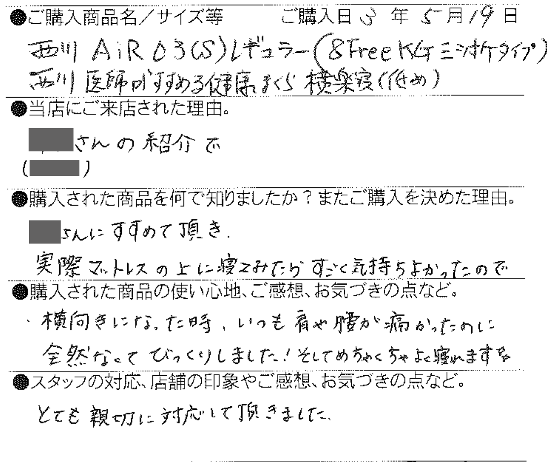 【西川】エアー03 レギュラー (S) ,医師が勧める健康まくら 横楽寝(低) 飯田市 40歳 女性 2021 5/27 お客様の声 2021年5月27日 お客様の声 人気急上昇中のタレント"高橋かの"さんの「まくら・マットレス選び」が西川からYouTubeが公開されました! 関連記事 【西川】[エアーポータブル]モバイルマット (S) 豊丘村 66歳 女性 2025年10月29日 【西川】&Free整圧マットレス -ハード(S)200cm 飯田市 33歳 男性 2025年5月28日 【西川】&Free整圧マットレス -ハード(S)200cm 飯田市 69歳 女性 2025年4月22日 【西川】&Free整圧マットレス -ハード195cm(D) 豊丘村 44歳 男性 2025年3月13日 【西川】エアーSX ハード三つ折りタイプ (S) 名古屋市 58歳 男性 2025年1月23日 【西川】AiR01-SE ベーシック(シングル) 飯田市 46歳 女性 2025年1月3日 【西川】&Free整圧マットレス -レギュラー195cm(S) 1台 / 羽毛ふとん(SL)2層キルトマザーグースダウン93% 飯田市 39歳 女性 2024年12月5日 【西川】エアーSX レギュラー (S) 飯田市 38歳 女性 2024年12月5日