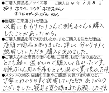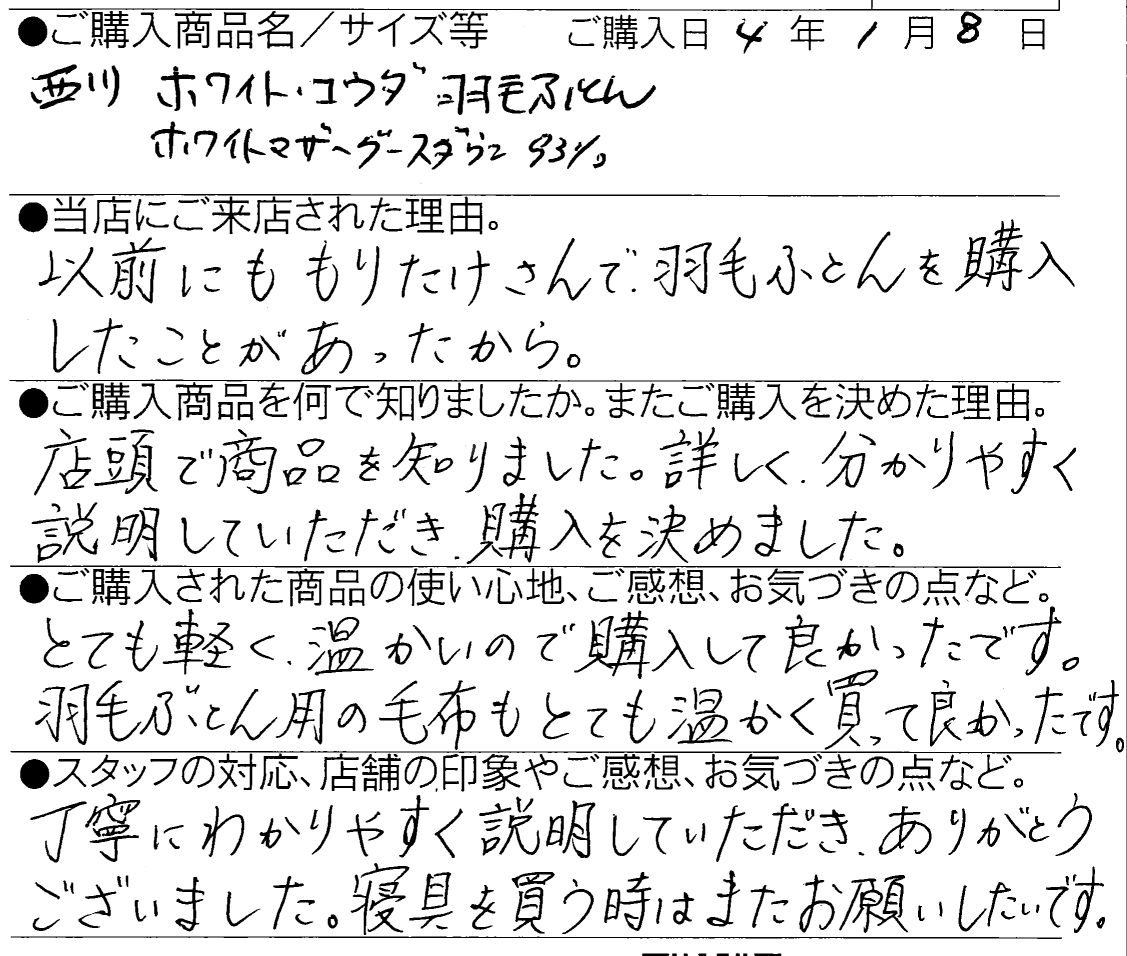 【西川】羽毛ふとん(ホワイト・コウダ) マザーグースダウン93% 飯田市 36歳 女性 2022 1/28 お客様の声 2022年1月28日 お客様の声 【西川】&Free整圧マットレス ハード(シングル) 飯田市 46歳 女性 「冬の寝具全品値下げ売り尽くし一掃セール」開催! 期間2/5(土)~27(日) 関連記事 【西川】[エアーポータブル]モバイルマット (S) 豊丘村 66歳 女性 2025年10月29日 【西川】&Free整圧マットレス -ハード(S)200cm 飯田市 33歳 男性 2025年5月28日 【西川】&Free整圧マットレス -ハード(S)200cm 飯田市 69歳 女性 2025年4月22日 【西川】&Free整圧マットレス -ハード195cm(D) 豊丘村 44歳 男性 2025年3月13日 【西川】エアーSX ハード三つ折りタイプ (S) 名古屋市 58歳 男性 2025年1月23日 【西川】AiR01-SE ベーシック(シングル) 飯田市 46歳 女性 2025年1月3日 【西川】&Free整圧マットレス -レギュラー195cm(S) 1台 / 羽毛ふとん(SL)2層キルトマザーグースダウン93% 飯田市 39歳 女性 2024年12月5日 【西川】エアーSX レギュラー (S) 飯田市 38歳 女性 2024年12月5日