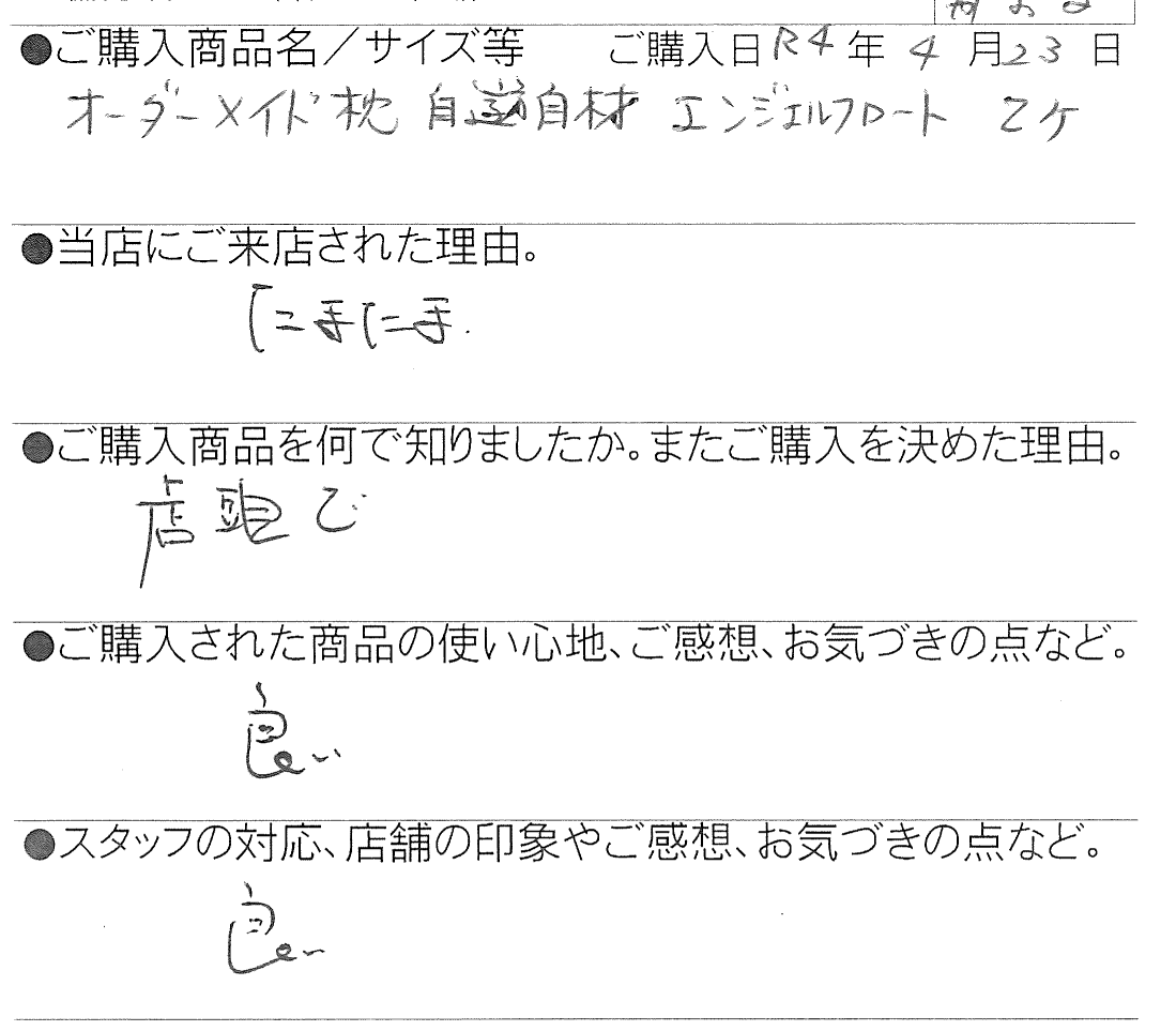 【西川】完全オーダーメイド枕 自遊自材(M) エンジェルフロート 松本市 64歳 女性