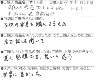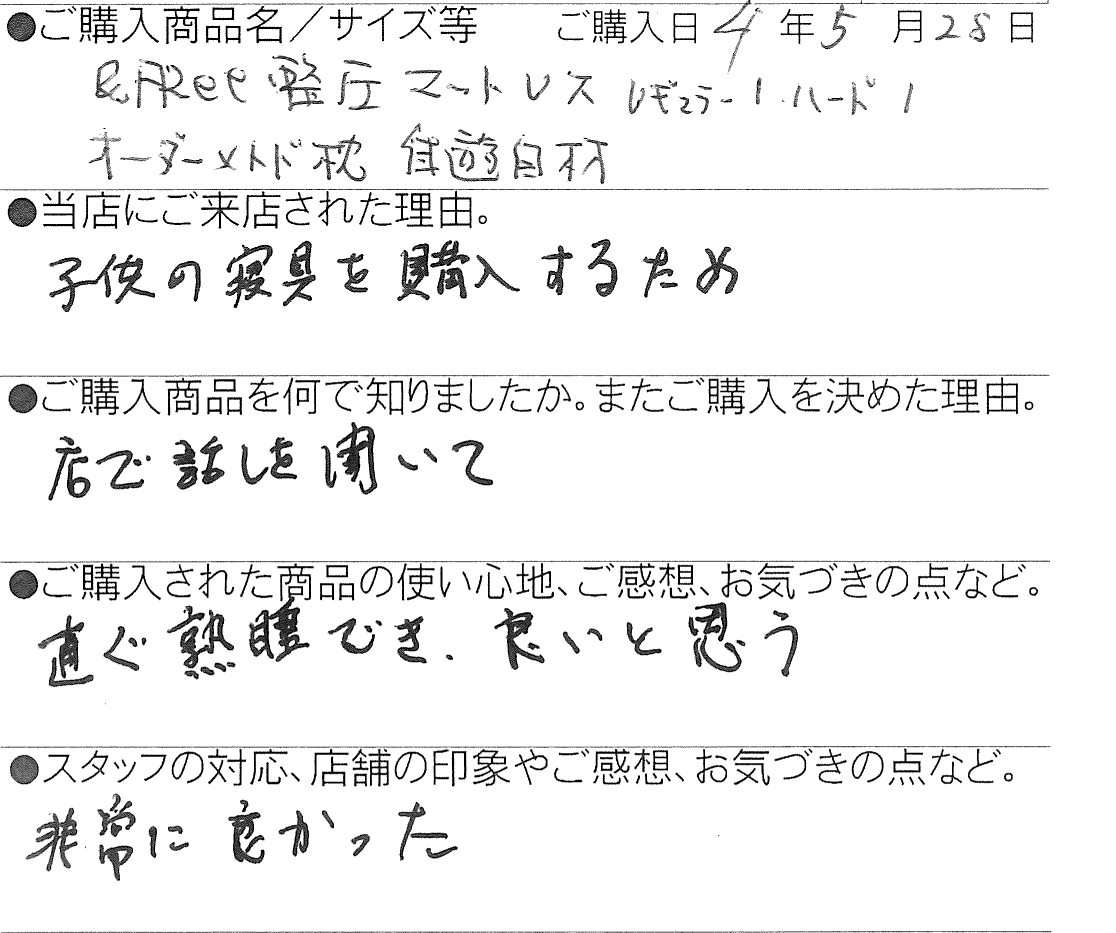 【西川】&Free整圧マットレス レギュラー(S)/ハード/(S) 2台 松本市 60代 夫婦 2022 7/23 お客様の声 2022年7月23日 お客様の声 【西川】完全オーダーメイド枕 自遊自材(M) エンジェルフロート 松本市 64歳 女性 "まくら"を変えて快適に眠りましょう! オーダーメイド枕がお勧めです! 関連記事 【西川】[エアーポータブル]モバイルマット (S) 豊丘村 66歳 女性 2025年10月29日 【西川】&Free整圧マットレス -ハード(S)200cm 飯田市 33歳 男性 2025年5月28日 【西川】&Free整圧マットレス -ハード(S)200cm 飯田市 69歳 女性 2025年4月22日 【西川】&Free整圧マットレス -ハード195cm(D) 豊丘村 44歳 男性 2025年3月13日 【西川】エアーSX ハード三つ折りタイプ (S) 名古屋市 58歳 男性 2025年1月23日 【西川】AiR01-SE ベーシック(シングル) 飯田市 46歳 女性 2025年1月3日 【西川】&Free整圧マットレス -レギュラー195cm(S) 1台 / 羽毛ふとん(SL)2層キルトマザーグースダウン93% 飯田市 39歳 女性 2024年12月5日 【西川】エアーSX レギュラー (S) 飯田市 38歳 女性 2024年12月5日