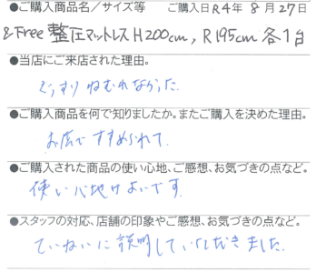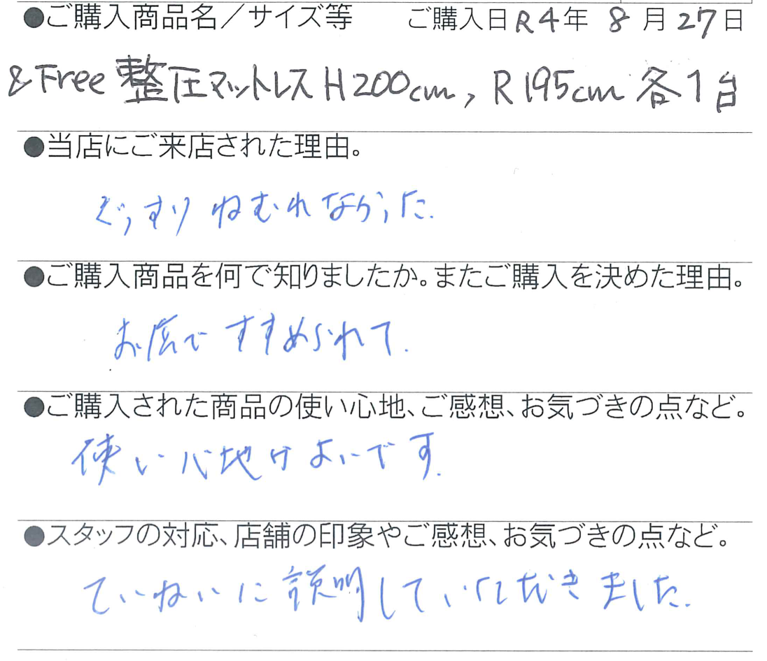 【西川】&Free整圧マットレス -ハード200cm(S)/レギュラー195cm(S) 各1台 飯田市 50代 夫婦 2022 10/13 お客様の声 2022年10月13日 お客様の声 【西川】完全オーダーメイド枕H(パフ) 飯田市 30歳 男性 「羽毛ふとん大放出セール」開催中! 値上が前の価格でお得です!! 期間11月6日(日)まで 関連記事 【西川】[エアーポータブル]モバイルマット (S) 豊丘村 66歳 女性 2025年10月29日 【西川】&Free整圧マットレス -ハード(S)200cm 飯田市 33歳 男性 2025年5月28日 【西川】&Free整圧マットレス -ハード(S)200cm 飯田市 69歳 女性 2025年4月22日 【西川】&Free整圧マットレス -ハード195cm(D) 豊丘村 44歳 男性 2025年3月13日 【西川】エアーSX ハード三つ折りタイプ (S) 名古屋市 58歳 男性 2025年1月23日 【西川】AiR01-SE ベーシック(シングル) 飯田市 46歳 女性 2025年1月3日 【西川】&Free整圧マットレス -レギュラー195cm(S) 1台 / 羽毛ふとん(SL)2層キルトマザーグースダウン93% 飯田市 39歳 女性 2024年12月5日 【西川】エアーSX レギュラー (S) 飯田市 38歳 女性 2024年12月5日