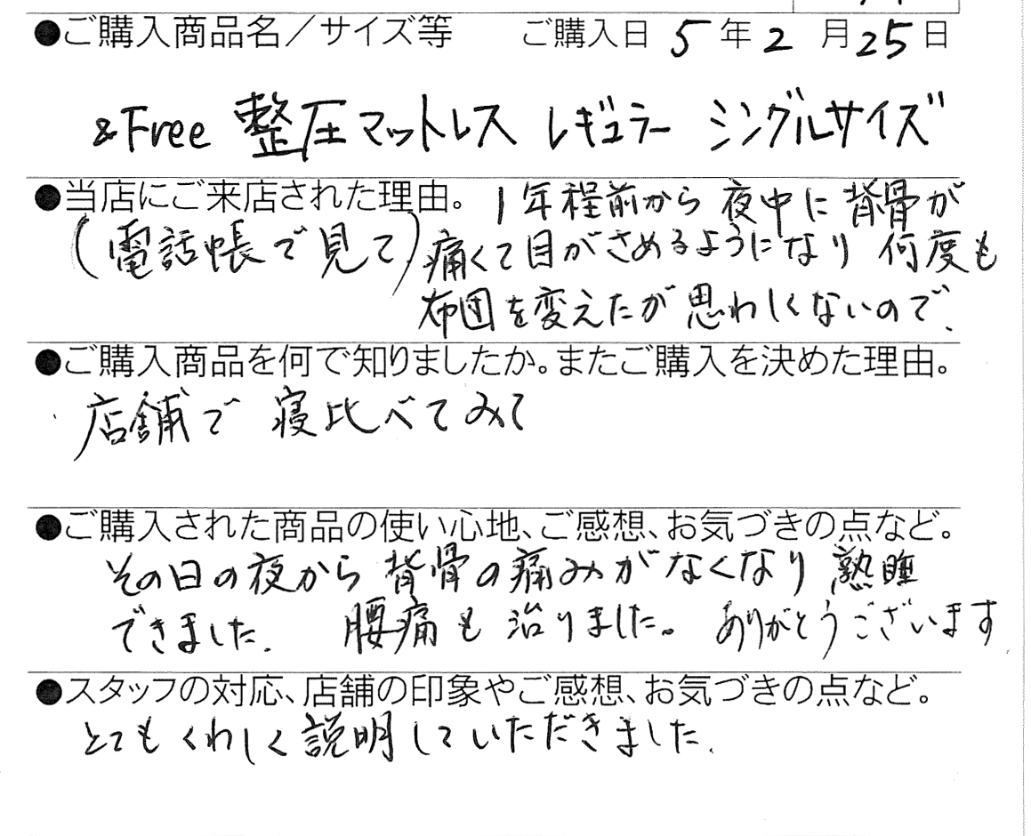 【西川】&Free整圧マットレス (S) レギュラー195cm(S) 1台 下條村 60代 女性 2023 3/25 お客様の声 2023年3月25日 【西川】&Free整圧マットレス お客様の声 【西川】AiR-03マットレス ハード195cm(S)/レギュラー195cm(S) 各1台 高森町 60代 夫婦 「信濃毎日新聞 5月23日朝刊」に当店の羽毛ふとん仕立直し・リメイクについての記事が掲載されました 関連記事 【西川】[エアーポータブル]モバイルマット (S) 豊丘村 66歳 女性 2025年10月29日 【西川】&Free整圧マットレス -ハード(S)200cm 飯田市 33歳 男性 2025年5月28日 【西川】&Free整圧マットレス -ハード(S)200cm 飯田市 69歳 女性 2025年4月22日 【西川】&Free整圧マットレス -ハード195cm(D) 豊丘村 44歳 男性 2025年3月13日 【西川】エアーSX ハード三つ折りタイプ (S) 名古屋市 58歳 男性 2025年1月23日 【西川】AiR01-SE ベーシック(シングル) 飯田市 46歳 女性 2025年1月3日 【西川】&Free整圧マットレス -レギュラー195cm(S) 1台 / 羽毛ふとん(SL)2層キルトマザーグースダウン93% 飯田市 39歳 女性 2024年12月5日 【西川】エアーSX レギュラー (S) 飯田市 38歳 女性 2024年12月5日