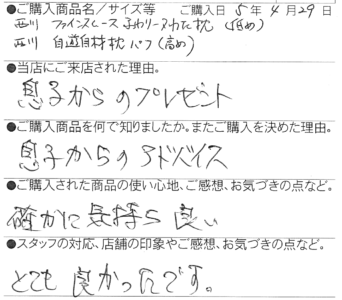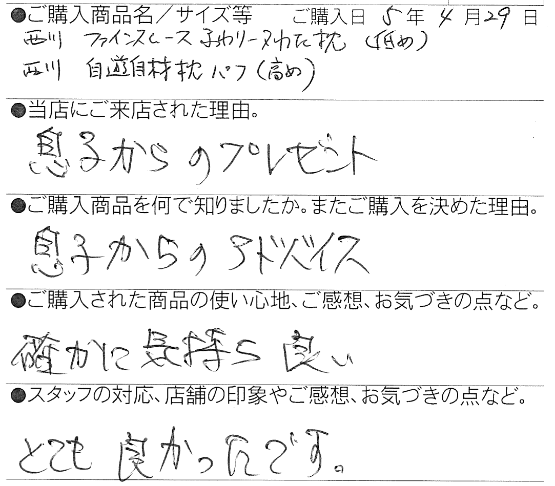 【西川】ファインスムース フワリーヌわた枕/オーダーメイド枕 ベーシック パフ 山梨県 60代 夫婦 2023 5/23 お客様の声 2023年5月23日 お客様の声 「信濃毎日新聞 5月23日朝刊」に当店の羽毛ふとん仕立直し・リメイクについての記事が掲載されました 「おふとんメンテナンスキャンペーン」開催です! 5月27日(土)から6月30日(金) 関連記事 【西川】[エアーポータブル]モバイルマット (S) 豊丘村 66歳 女性 2025年10月29日 【西川】&Free整圧マットレス -ハード(S)200cm 飯田市 33歳 男性 2025年5月28日 【西川】&Free整圧マットレス -ハード(S)200cm 飯田市 69歳 女性 2025年4月22日 【西川】&Free整圧マットレス -ハード195cm(D) 豊丘村 44歳 男性 2025年3月13日 【西川】エアーSX ハード三つ折りタイプ (S) 名古屋市 58歳 男性 2025年1月23日 【西川】AiR01-SE ベーシック(シングル) 飯田市 46歳 女性 2025年1月3日 【西川】&Free整圧マットレス -レギュラー195cm(S) 1台 / 羽毛ふとん(SL)2層キルトマザーグースダウン93% 飯田市 39歳 女性 2024年12月5日 【西川】エアーSX レギュラー (S) 飯田市 38歳 女性 2024年12月5日
