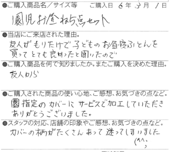 手作り 園児お昼寝ふとん5点セット 飯田市 27歳 女性 2024 3/14 お客様の声 2024年3月14日 お客様の声 【西川】温熱電位敷ふとんヘルシオン (S) 飯田市 65歳 女性 【西川】AiR-03マットレス (S)ハード 飯田市 30代 女性 関連記事 【西川】[エアーポータブル]モバイルマット (S) 豊丘村 66歳 女性 2025年10月29日 【西川】&Free整圧マットレス -ハード(S)200cm 飯田市 33歳 男性 2025年5月28日 【西川】&Free整圧マットレス -ハード(S)200cm 飯田市 69歳 女性 2025年4月22日 【西川】&Free整圧マットレス -ハード195cm(D) 豊丘村 44歳 男性 2025年3月13日 【西川】エアーSX ハード三つ折りタイプ (S) 名古屋市 58歳 男性 2025年1月23日 【西川】AiR01-SE ベーシック(シングル) 飯田市 46歳 女性 2025年1月3日 【西川】&Free整圧マットレス -レギュラー195cm(S) 1台 / 羽毛ふとん(SL)2層キルトマザーグースダウン93% 飯田市 39歳 女性 2024年12月5日 【西川】エアーSX レギュラー (S) 飯田市 38歳 女性 2024年12月5日
