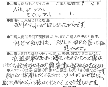 【西川】[エアーポータブル]モバイルマット (S) 豊丘村 66歳 女性 2025 10/29 お客様の声 2025年10月29日 お客様の声 改装中店舗の道向かいです。駐車場は店舗となりの[お客様🅿]または[市営地下🅿]をご利用ください。 あったか羽毛ふとん-テレフォンショッピングセール開催! 期間 11月8日(土)より12月14日(日) 関連記事 【西川】&Free整圧マットレス -ハード(S)200cm 飯田市 33歳 男性 2025年5月28日 【西川】&Free整圧マットレス -ハード(S)200cm 飯田市 69歳 女性 2025年4月22日 【西川】&Free整圧マットレス -ハード195cm(D) 豊丘村 44歳 男性 2025年3月13日 【西川】エアーSX ハード三つ折りタイプ (S) 名古屋市 58歳 男性 2025年1月23日 【西川】AiR01-SE ベーシック(シングル) 飯田市 46歳 女性 2025年1月3日 【西川】&Free整圧マットレス -レギュラー195cm(S) 1台 / 羽毛ふとん(SL)2層キルトマザーグースダウン93% 飯田市 39歳 女性 2024年12月5日 【西川】エアーSX レギュラー (S) 飯田市 38歳 女性 2024年12月5日 羽毛ふとんリフォーム 飯田市 50歳 女性 2024年12月5日